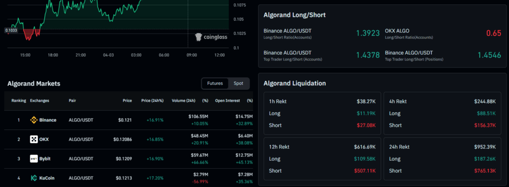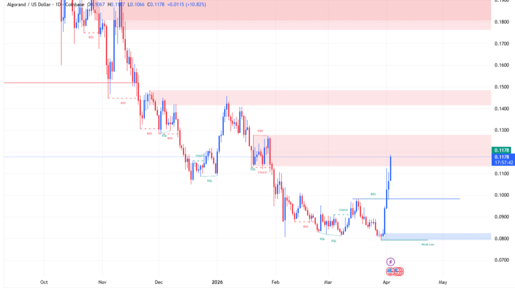 Algorand’s native token ALGO is back in the spotlight, posting a sharp 17% gain over the past 24 hours and extending a relentless four-day rally. The move has now pushed price action into a critical supply zone around $0.1133 — a level that could define whether this breakout has real legs or fades into consolidation.