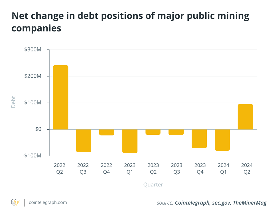 Mùa đông crypto 2022 đã khiến nhiều công ty khai thác Bitcoin lạm dụng tài chính bằng nợ phải tuyên bố phá sản. Hầu hết các công ty khai thác niêm yết công khai có tỷ lệ nợ trên vốn chủ sở hữu trên 4, trong khi giá trị trên 2 đã thường được coi là không bền vững. Bắt đầu từ quý 3/2022, ngành khai thác Bitcoin bắt đầu xóa nợ. Ngoại lệ duy nhất cho xu hướng giảm nợ là quý 2/2024, bị “lệch” do khoản đầu tư 150 triệu USD vào Hut 8.