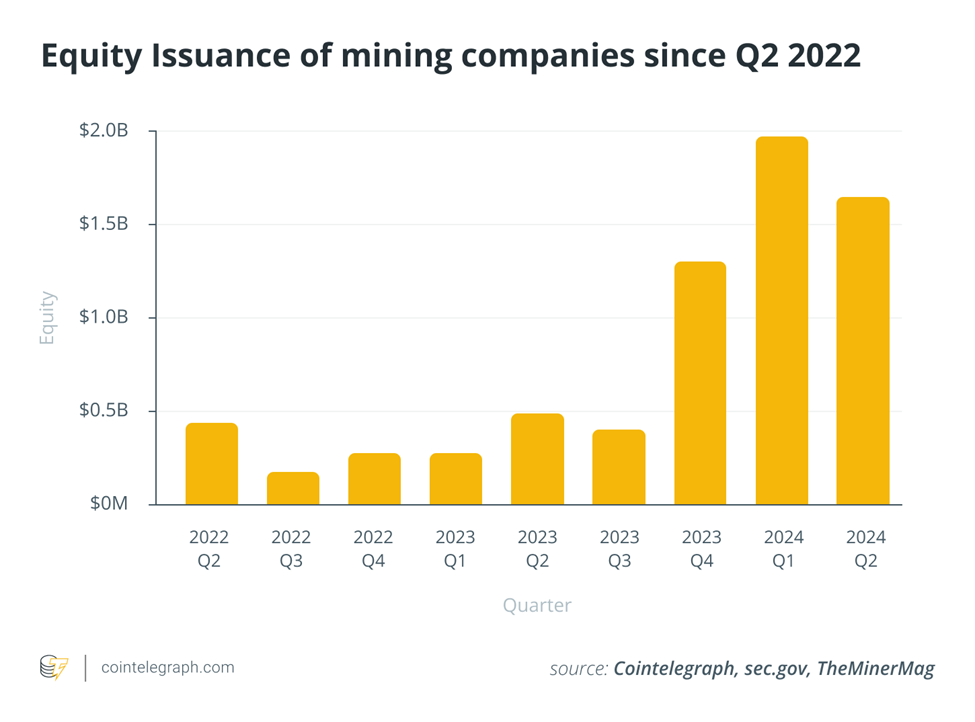Từ quý 4/2023, các công ty khai thác ngày càng phát hành cổ phiếu để tài trợ hoạt động. Hơn 4,9 tỷ USD đã được huy động từ quý 3/2023 đến quý 2/2024, cao hơn 300% so với ba quý trước đó. Mức tăng lớn nhất diễn ra trong quý 1/2024, với gần 2 tỷ USD được huy động.